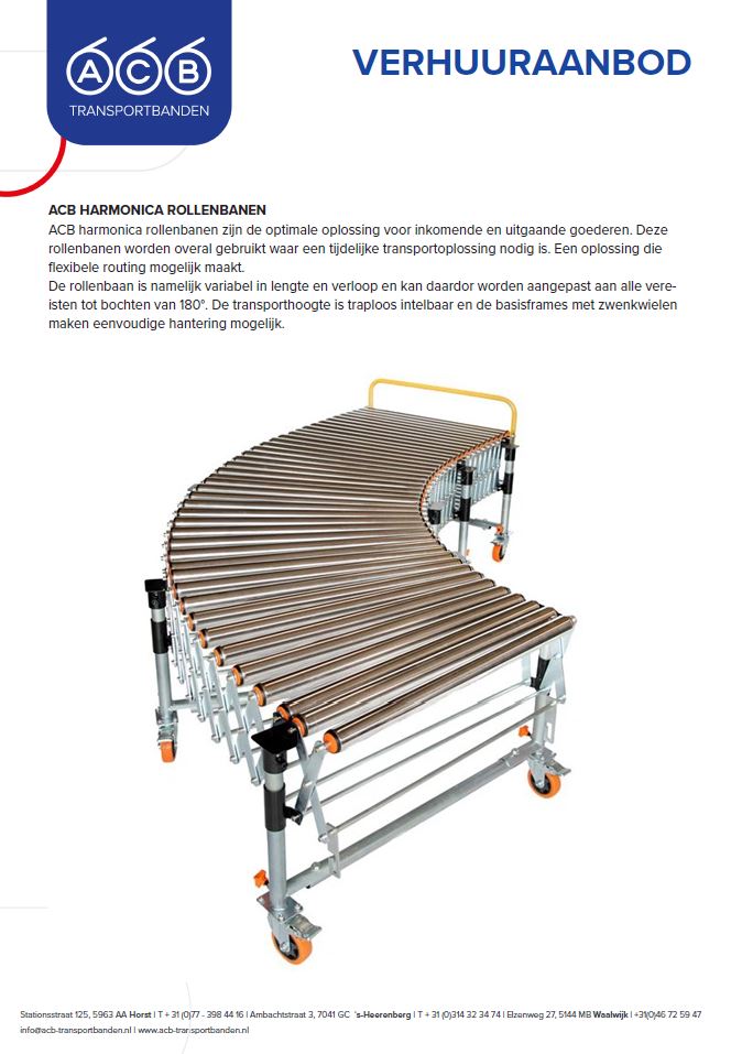 Rollenbanen worden gebruikt voor het intern en extern transporteren van bijvoorbeeld dozen, kratten of pallets. In deze uitgebreide product brochure vindt je een overzicht van ons aanbod.